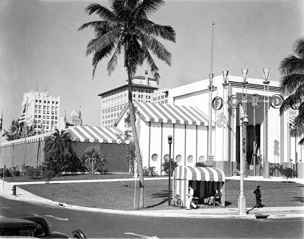 The earliest the style, at least in terms of the aesthetic we’ve come to know as Deco, really took root in the 1930s following the reconstruction period in the wake of the cataclysmic 1926 Hurricane. In the 20s, the prevailing styles were Mediterranean Revival and Mediterranean Moderne (a far cry from the sleek geometries boasted by Deco cousins abroad). `